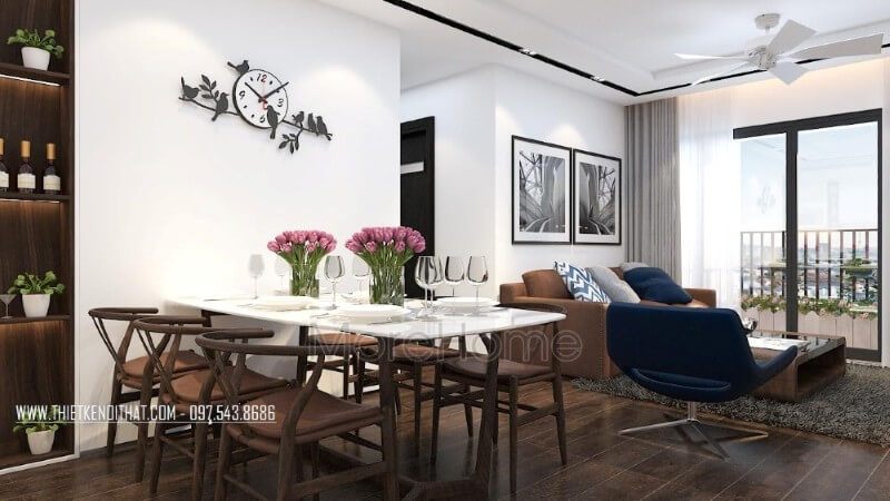 Khu vực phòng ăn chung cư hiện đại được thiết kế gần kề với phòng khách, tạo nên một không gian sống thoải mái, sang trọng và đầy đủ tiện nghi.